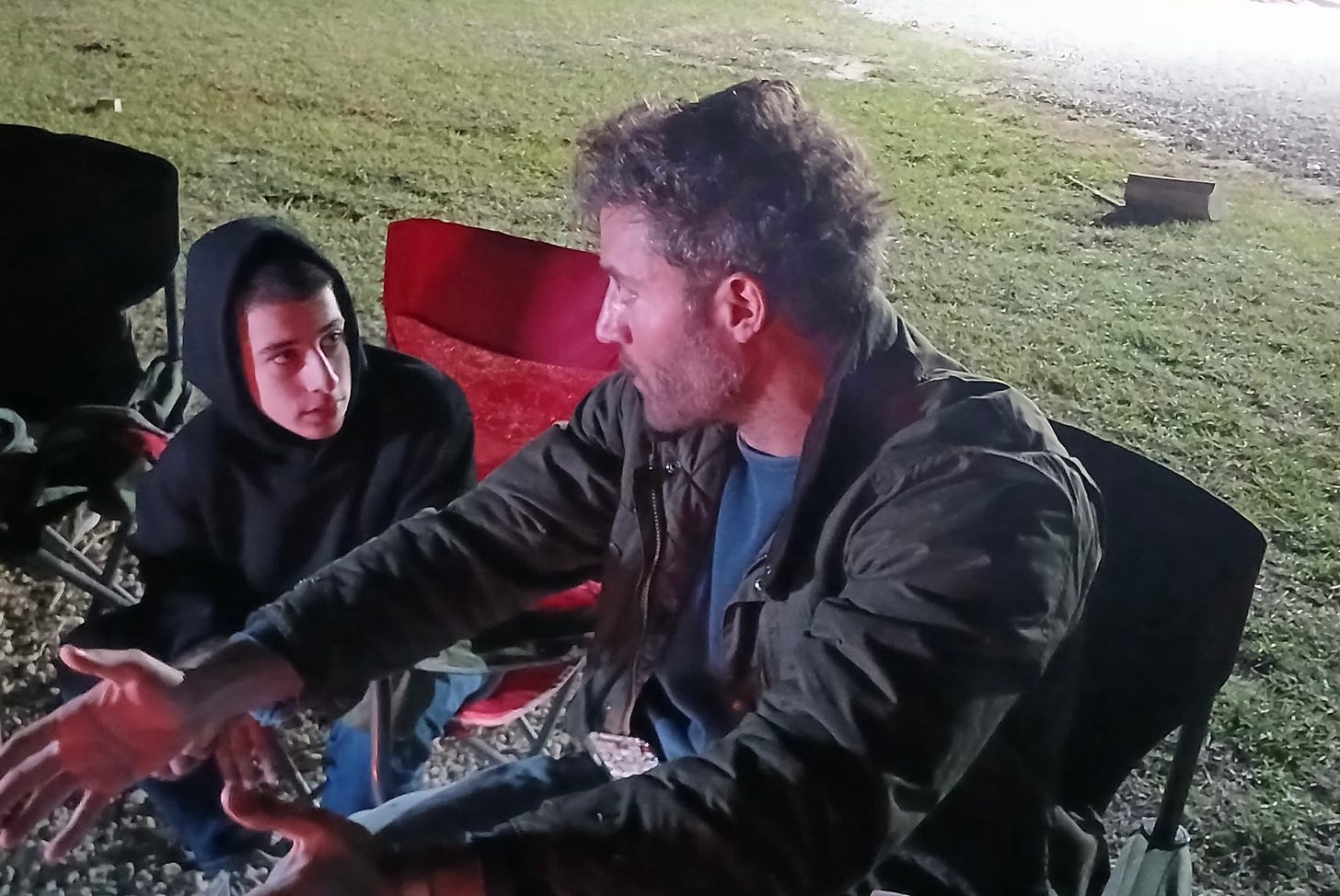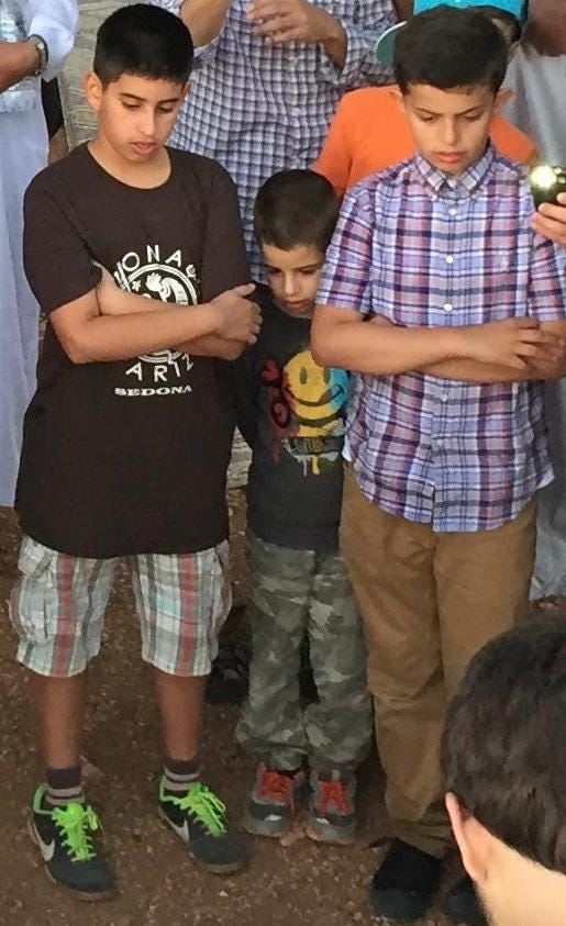 They had two ATVs, and Mohammed couldn’t stay off them. He tore around the property for three hours, stopping only for dinner, meat sajiyeh with tomatoes, cooked over an open fire by his uncle Zeyad. It was, frankly, loud and annoying, but no one had the heart to stop him. “You can’t make up for everything in one night,” Zeyad told Mohammed when he drove by for a snack. He laughed and kept going. I went along for a joyride and bailed when I realized he was trying to break the sound barrier. When he finally joined us by the fire, he tried to chop wood, couldn’t free the axe after the first swing, dropped it, and moved on. He picked up a giant log we’d been using as a seat and tossed it into the fire, toppling the carefully stacked pile. A small transgression; everyone groaned, then a cousin rebuilt the fire without comment. We sat around drinking coffee and talking. About family, business, politics, Israel-Palestine. Their views are all over the map—something to unpack another time. A ten-year-old explained the Big Bang to me.