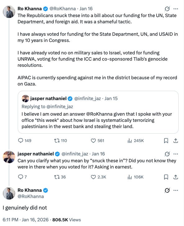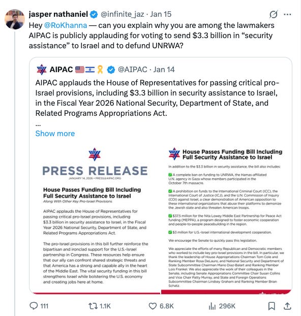 That complicity continues to this day, including from presidential hopeful Rep. Ro Khanna, who, just last week, voted for a bill that defunded UNRWA while sending security assistance to Israel. Days later, he offered a textbook display of liberal hypocrisy by circulating a strongly worded letter condemning Israel’s actions in the West Bank. (In September, Khanna also signed onto a letter decrying “man-made mass starvation,” apparently without noticing what policies were helping produce it.)