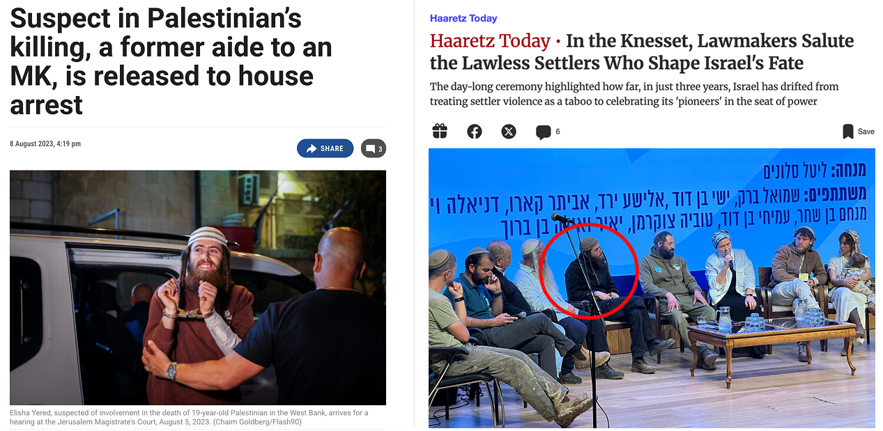 On a podcast last week, Yered—who was once detained over the fatal shooting of a Palestinian teenager; is an open theorist of coordinated settler-state land seizures; was present during last month’s pogrom that killed a Palestinian American; and was recently feted at a Knesset tribute to the settlement movement—explained that settler violence in any form is fundamentally an act of self-defense.